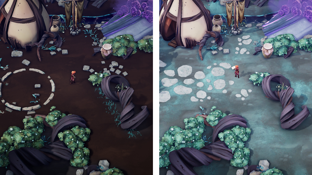 There are no small improvements. Some areas were too messy, with too many decorative elements (grass, ruins), and the ground color was too similar to our main character's outfit making her barely visible. The joy of post-production.