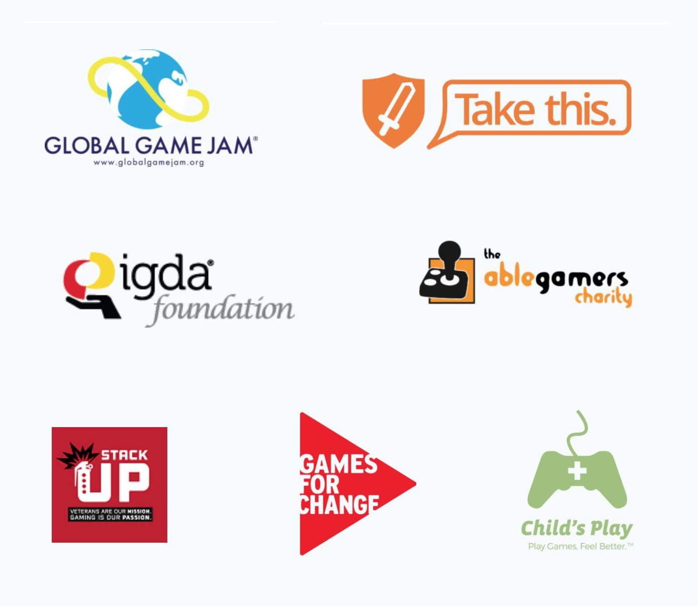 The charities are: Global Game Jam, IGDA Foundation, Take This, Chid's Play, The AbleGamers Charity, Games For Change and Stack Up.