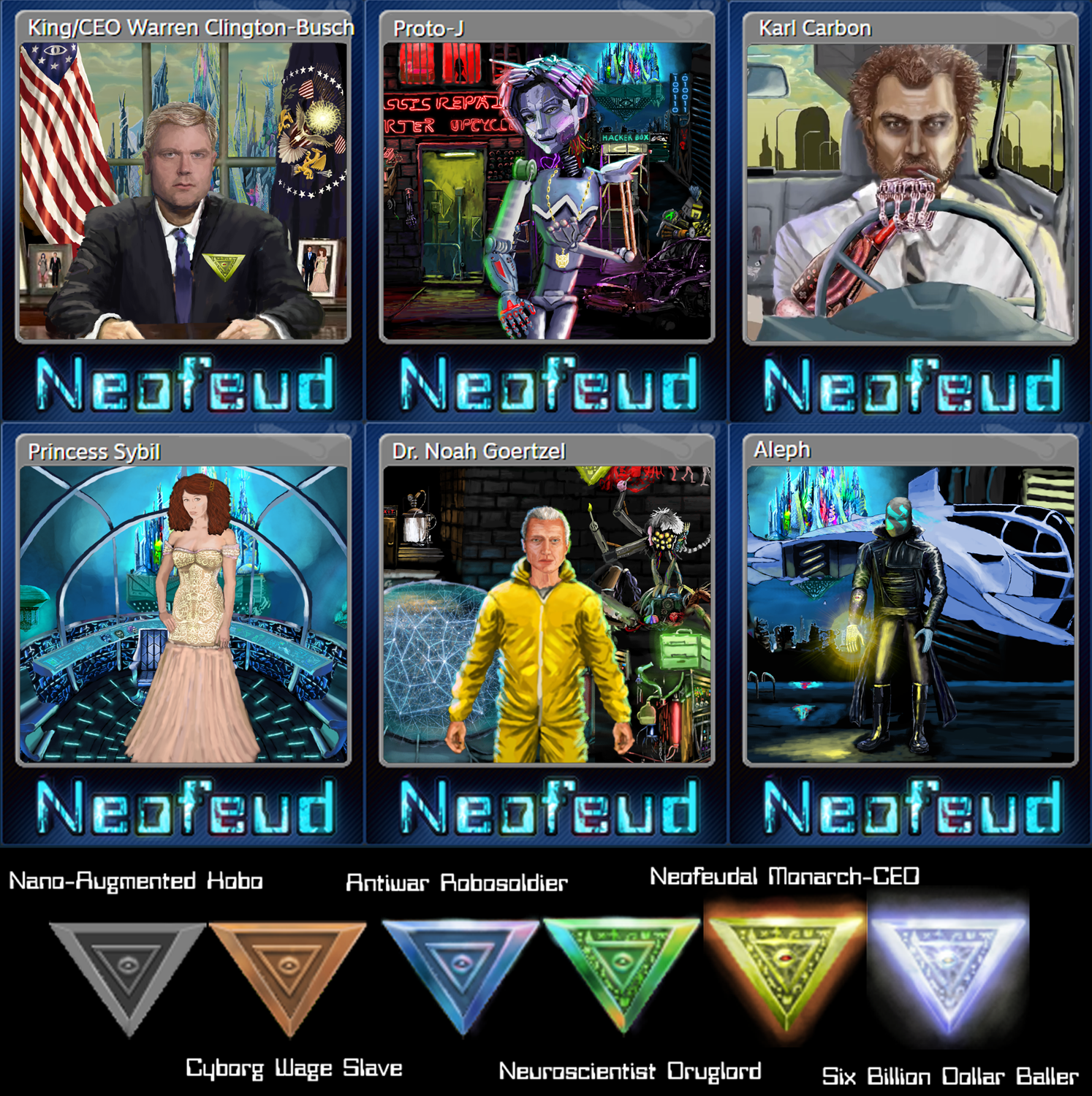 And at long last, Neofeud Steam trading cards are now available! Go from Nano-Augmented Hobo to Cyborg Wage Slave to Neofeudal Monarch-CEO and finally Six Billion Dollar Baller! :D