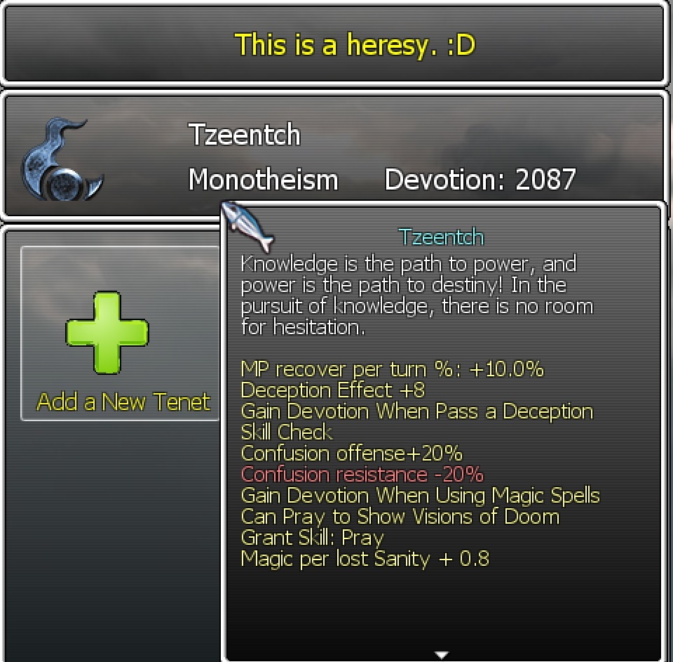 A New Faith Tenet about Fishing As we are at it. I've added a new faith tenet for fishing enthusiasts. You can now gain devotion by fishing, thanks to a system that checks faith effects during skill checks. This tenet also offers an alternative for those seeking fishing skills without selling their souls to Cthulhu. Other faith tenets have also been updated. For example, “The Grand Masquerade” now grants devotion for passing deception skill checks. But where can we find more deception skill checks? Well, let's go down this path further.