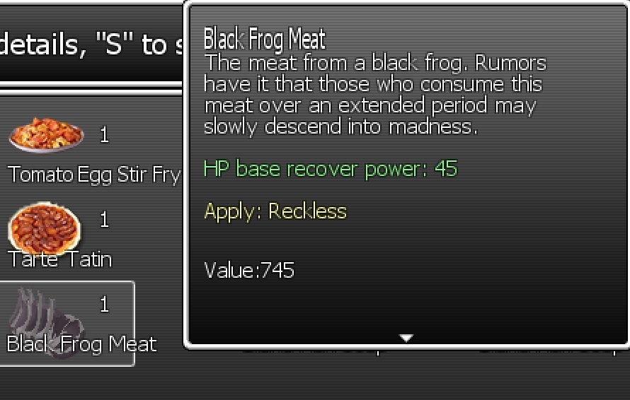 20241006 English ############Content############## [Enemy]New Enemy: Black Frog (Fully animated.) [Pet]You can turn Black Frogs into pets [The Black Frog Cave]Black Frogs now appear here. [The Black Frog Cave]Added some bones as decorations. [Loot]Added an item loot list for Black Frogs. [Enemy]Black Frogs will attack with other types of frogs. [Meat]New Meat: Black Frog Meat. (Apply: Reckless. If you use this type of meat to cook, the dish you made may also inherit this attribution.) [Wiki]More details of Black Frogs as enemies or pets can be found on the game's wiki. [Wonderland Travel Agency]Procedurally generated caves may now have the "Frog" theme. 简体中文 ##########Content################ 【敌人】新敌人:黑蛙 (包含全部的动画。) 【宠物】你可以将黑蛙变成宠物。 【黑蛙洞穴】这里现在会有黑蛙。 【黑蛙洞穴】加入了一些装饰用的骨头。 【掉落物】为黑蛙加入了物品掉落清单。 【敌人】黑蛙会和其它的蛙类一起攻击。 【肉】新的肉类:黑蛙肉(会施加效果:背水之阵。如果你用这种肉进行料理,产生的料理会继承这种属性) 【维基】更多的关于黑蛙作为敌人和宠物的信息加入到了游戏的维基上。 【奇幻之地旅行社】过程生成的洞穴现在可能有【蛙类】主题。