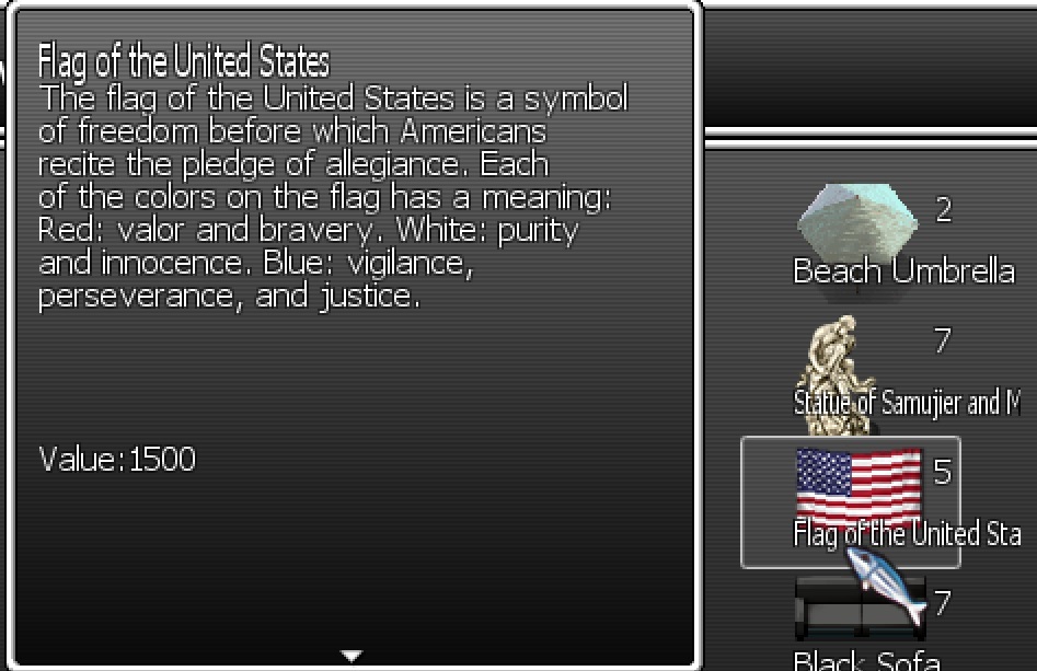 English ############Content############### [The Underwater Tunnel]Added a guide in the Jaruka direction to fast-traverse this part of the tunnel. [Furniture]The Flag of the United States is now also a furniture item that you can deploy whenever and wherever you want. [Shopping]Bob's Grocery now sells the Flags of the United States. (If you sacrificed Bob at the end of the first chapter, you can still travel back in time to buy that in 1978.) [Shopping]Alternatively, random scavagers in Queensmouth may have a 50% chance to sell the Flags of the United States. [Queensmouth]Added a flag of the United States in the secret room of the Junkyard House. (The one you can enter during the quest: "The Wrong Side of the History.") 简体中文 ##########Content################# 【海底隧道】在加鲁卡方向加入了一个导游,用于快速通过这个部分的海底隧道。 【家具】美国国旗现在也是一种你可以在任何地方和任何地点部署的家具物品。 【购物】鲍勃的杂货店现在会出售美国国旗。(如果你在第一章最后献祭掉了鲍勃。你依然可以通过某本书回到1978年去进行购买。) 【购物】王后镇的随机拾荒者可能有50%的概率出售美国国旗。 【王后镇】在垃圾场小屋的秘密房间里加入了一面美国国旗。(就是那间在《历史的错误一边》任务中可以进入的房间。)