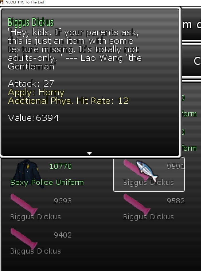 20231228 English ############Development################ Added a new video about the end of 2023: https://www.youtube.com/watch?v=wbS1dQKkC5I ############Content################ [Weapon]New Weapon: Biggus Dickus (It can have prefixes and additional special attributions. However, the prefix is not shown on its name.) [Den of Pleasure]Lao Wang now sells "Biggus Dickus." 简体中文 ############Development################ 加入了2023年年度总结影片:https://youtu.be/tXA1tpk29CM ############Content################ 【武器】新武器:比格斯·狄克斯 (可以有词缀和特殊属性。但是在名字上不显失词缀) 【欢愉之巢】隔壁老王现在会贩卖比格斯·狄克斯