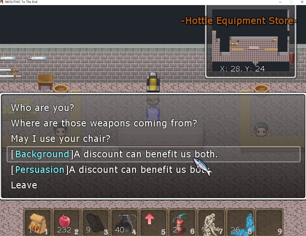 English ############Content################ [Item]New Item Template: Leather Armor [Loot]Longdead Rome Soldiers may now drop Leather Armors. [Hottle Equipment Store]Added a new merchant who sells equipment with "wind-proof" prefixes. (Their attributions are a bit lower than the random loots dropped by enemies.) [Hottle Equipment Store]Added an interactive chair. [Hottle Equipment Store]Added a forge master. [Hottle Equipment Store]The forge master can provide you with some information. [Hottle Equipment Store]You can convince the forge master to give you a discount either by the business person's background or your persuasion skill. [Hottle Equipment Store]Added an inside joke. XD #############System################ Almost all equipment OIG codes are now in a new format. It shall allow all of them to easily become a craftable item later if needed. They are now also under the management of a unified prefix manager. Some unique equipment remains in the old format as they manage their prefixes. Standard auto-debugs have been performed on those code changes, and one bug was detected and annihilated. (Located in the function: change_prefixValue_in_pplist) 简体中文 ############Content################ 【物品】新物品模版:皮甲 【掉落物】逝去千年的罗马士兵可能掉落皮甲。 【霍特尔装备店】加入了一个商人贩卖防风词缀的装备。(属性相对于敌人掉落的物品略低。) 【霍特尔装备店】加入了一只可以交互的椅子。 【霍特尔装备店】加入了一位熔炉大师。 【霍特尔装备店】熔炉大师会为你提供一些当地的信息。 【霍特尔装备店】你可以使用【打工人】背景或你的说服力技能来说服熔炉大师给你一个商店折扣。 【霍特尔装备店】加入了一个圈内梗。XD #############System################ 几乎所有的装备OIG代码现在使用新的格式,以便之后它们都可能被容易地转化为可以制造的物品。同时,他们的词缀现在统一被一个词缀管理器控制。 一些较为独特的装备依然使用旧的格式,并且自行管理词缀。 自动化代码检测对所有变动代码进行了扫描,发现一处Bug,已经消灭。(位于函数: change_prefixValue_in_pplist)