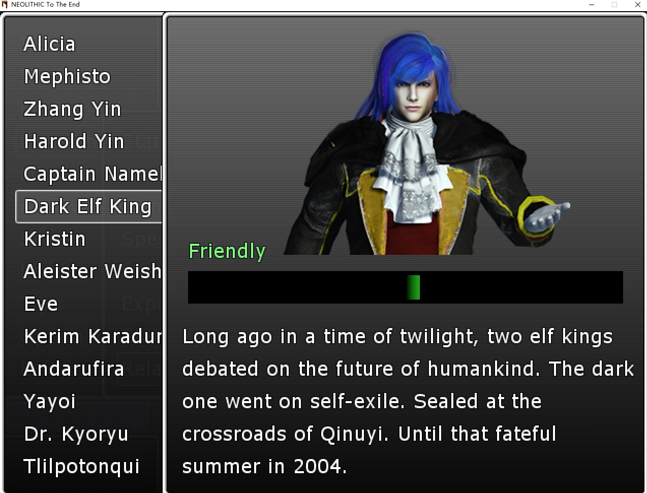 In this week's updated content, you will finally meet the Dark Elf King. He will reveal a memory that may be yours. (It's true for everyone who has played this game since 2004.) As epic as our long journey sounds, simple Text-to-Speech is not enough. Thus, an experimental text-to-song technology is in place whenever you open your relationship UI with him. Anyway, the Dark Elf King has returned. Just as his game-broken level of power as a recruitable companion, he will give a very strong spell book as he has a glance of hope that you may be that hero 19 years ago. The spell "Polar Hurricane" echoes back from that long-lost Stone Age. Even though this is a merely short encounter, you will meet him again later when the game world expands to Qinuyi.