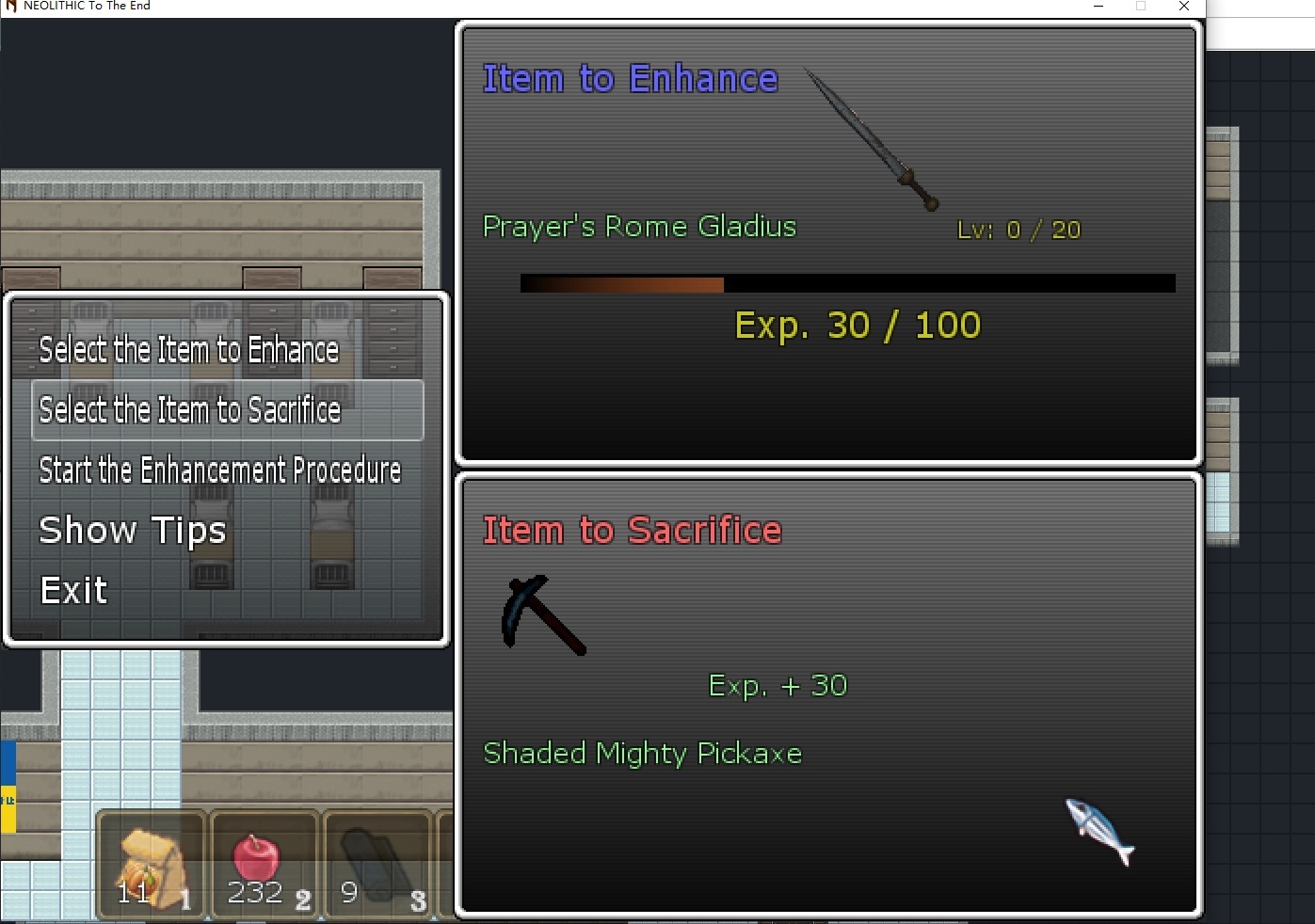 We now have a weapon enhancement system. Most of the weapons now have experience and levels on them. You can sacrifice other weapons and possibly some items that I will add in the future to provide them with Experience to level them up. Each enhancement level will provide a bonus to the weapon's many base attributions such as the attack value, the physical defense value, the magic defense value, the strength bonus, the endurance bonus, the speed bonus, the magic bonus, the Max HP bonus, and the Max MP bonus.