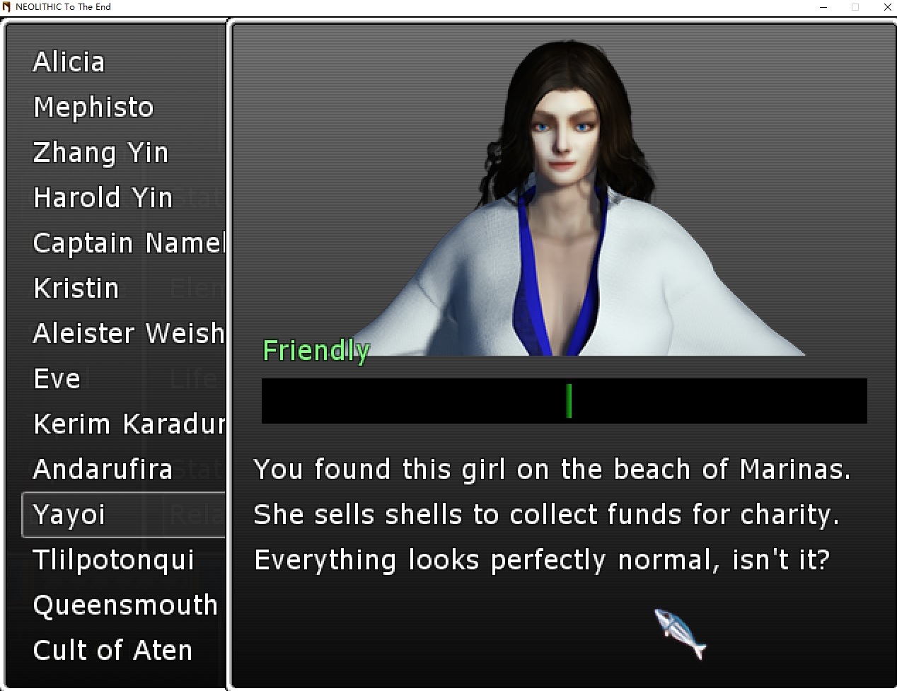 English ############Content################ [Yayoi]Added a full set of 3D assets for Yayoi. You can also use her appearance on yourself or your customized teammate. [Yayoi]After talking to her for the first time, you can check your relationship with her in the relationship menu. [Yayoi]Spending money to buy shells from her can improve your relationship with her. [Yayoi]She now thanks you for purchasing anything from her. 简体中文 ############Content################ 【弥生】给弥生加入了一整套3D图像资源。你也可以把她的外观用在你的主角或自定义队友身上。 【弥生】在首次和她交谈后,你现在可以在菜单中找到和她的关系度。 【弥生】花很多的钱从她这里购买贝壳的话,现在可以增加和她的关系度。 【弥生】她现在会在你购买任何东西之后感谢你。
