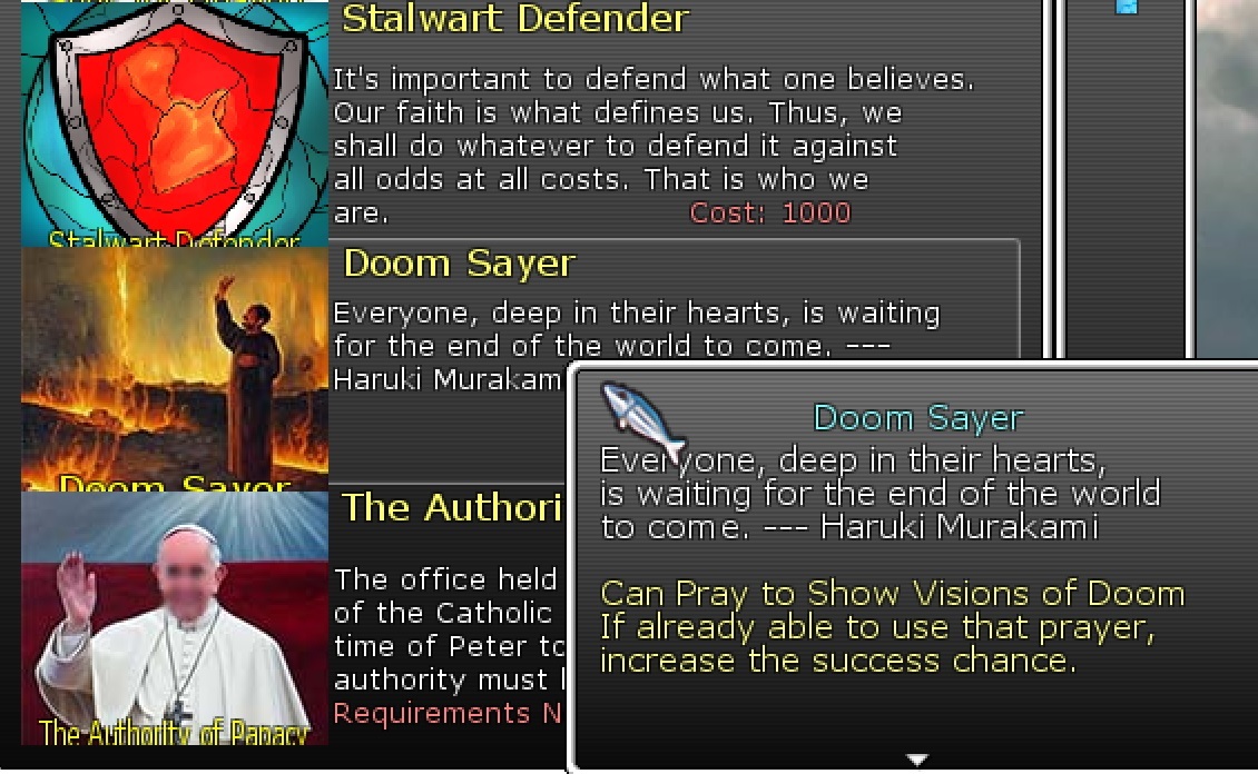 The title is a quote from the famous Japanese writer Haruki Murakami which is also used as the description of a new faith tenet added this week: Many religions have their own visions of the end of the world scenarios. Thus, we shall not let the followers of Nihilism have all the fun even though they do have a discount to add this tenet. With this tenet, everyone can show visions of doom to cause fear in their enemies.