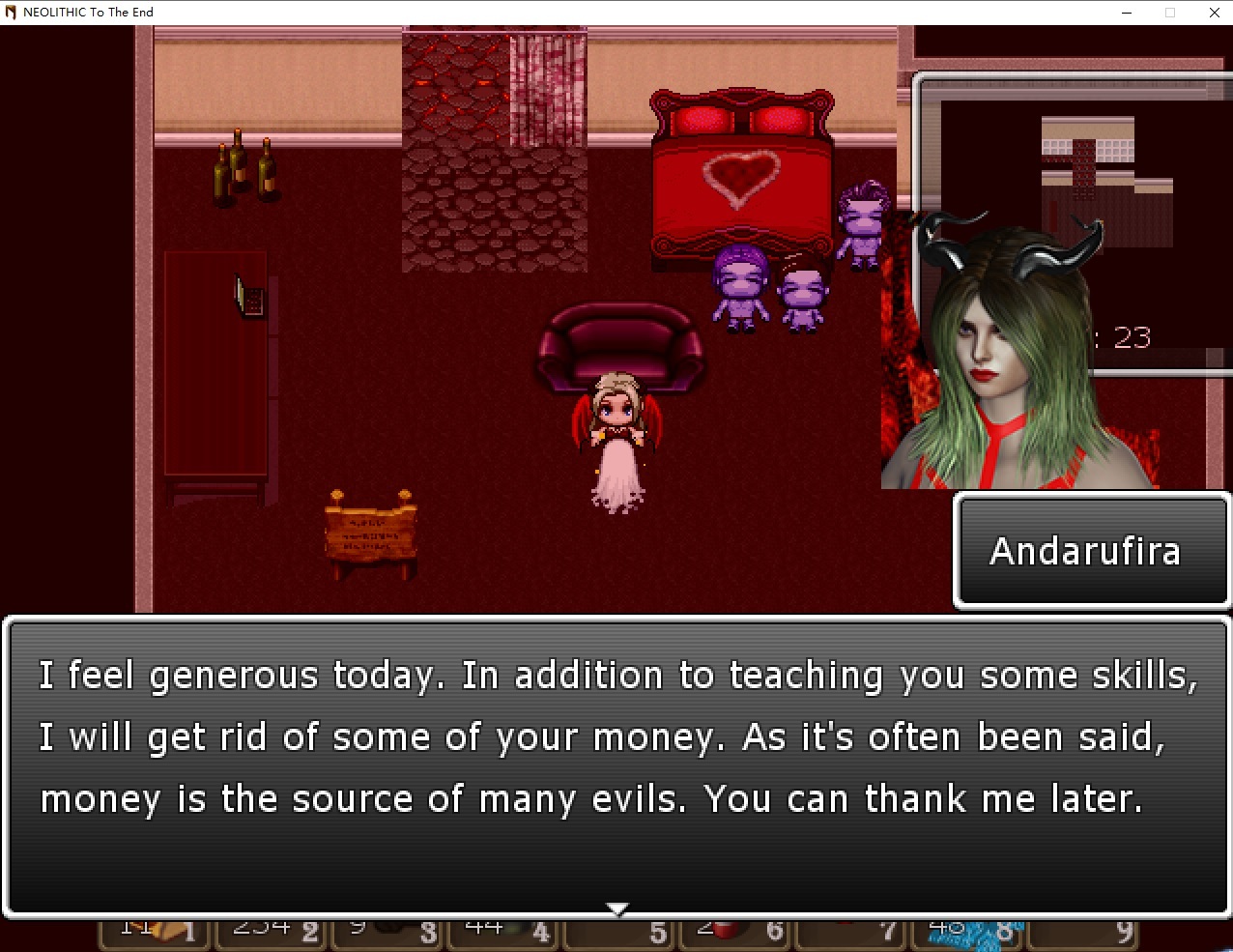 3, More Interacts With a Succubus In addition to having sex with Andarufira and getting murdered during the process with a cut scene, you now have more meaningful interactions with her. You can now send her gifts to improve your relationship with her, even though a better relationship still cannot stop her from killing when you try to lay with her. But, she may give you something in return. The Profane of Succubus may make your enemies suddenly fail in love with you and start to hit themselves rather than attack you. Moreover, she may agree to teach you some spells if you have a very positive relationship with her. Also, she is very kind to take away some of your money during the process. For the love of money is the root of all evil, according to the Bible.