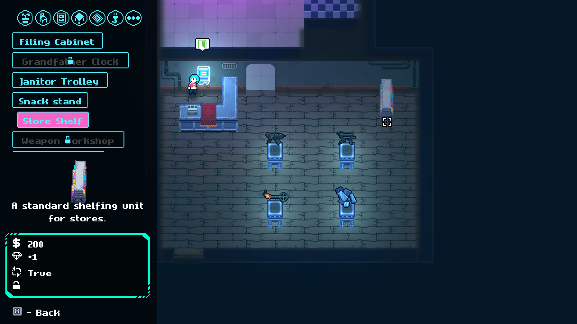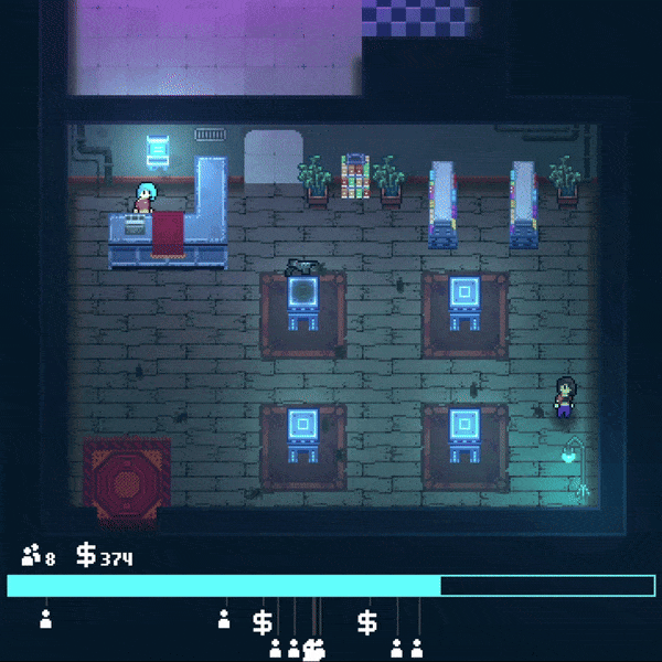 The store gameplay has been revamped. Neon Blight had very bare-bones store gameplay. Most of your time was spent waiting around with no real goal. Now when you open your store you will have 3 minutes to sell your items! As customers come in you'll have to make sure to clean the dirty footprints they leave behind to avoid a bad rating.
