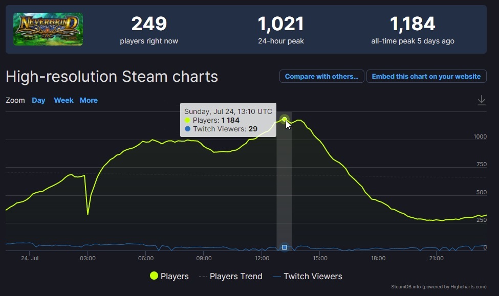 Nevergrind Online had a rocky week around peak hours and it cost us a few negative reviews due to causing disconnects and login queues. It is unfortunate, but we earned those negative reviews. Players should expect an online game to work most of the time and this was a rough week full of stumbling and bumbling toward the end zone. I even had to fix the idle disconnect logic on the client which was incorrectly causing disconnects mid-stream for NGC_the_Twitch. Thankfully, he was much more patient than most streamers would be. I was able to quickly resolve the issue within minutes, enabling him to finish the stream! You don't want your peak hour chart to look like this: