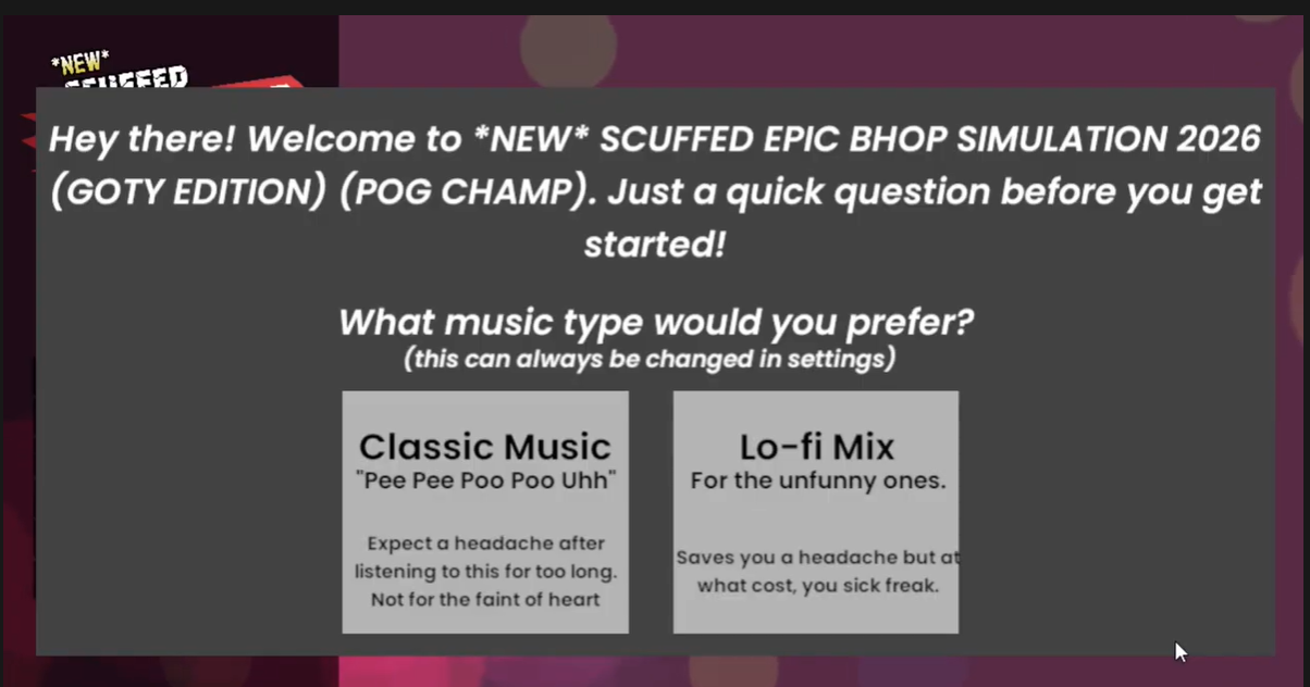 Music Choices ALL SONGS FROM THE ORIGINAL BHOP SIMULATOR RETURN FOR 2026. This includes seasonal music such as the "Spooky" we had for Halloween 2021. However this will NOT include music we introduced for Limited Time Crossovers (we will have some of these in 2026)
