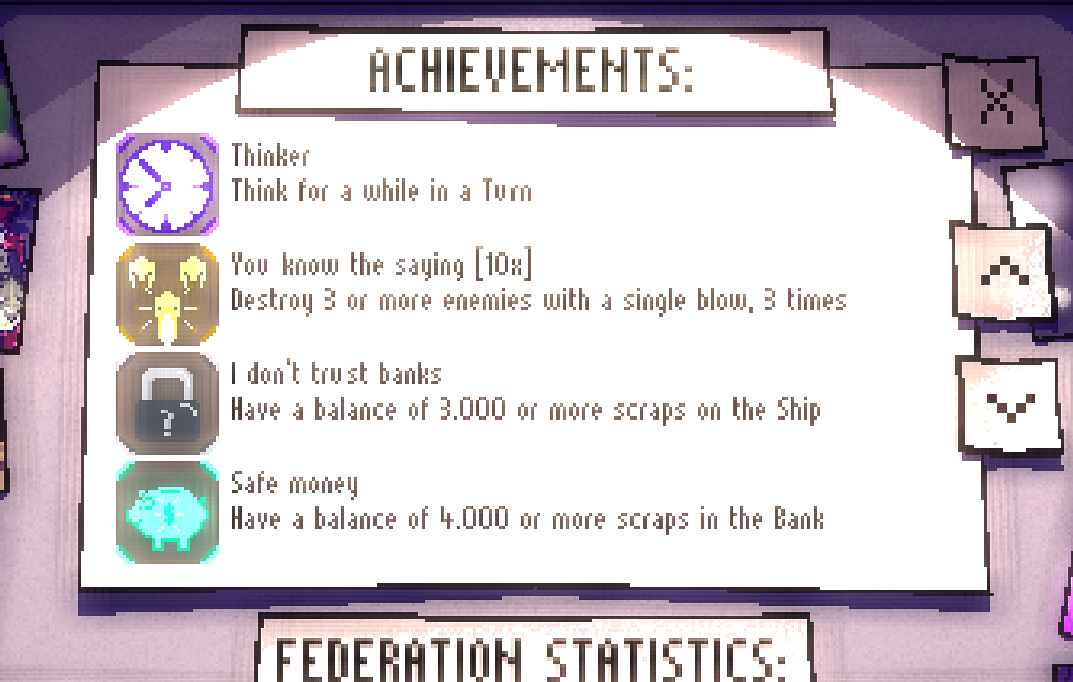 As well as an internal system of achievements (which are the same as those of Steam). There are 51 achievements made based on players' requests and observations of how the game is played.