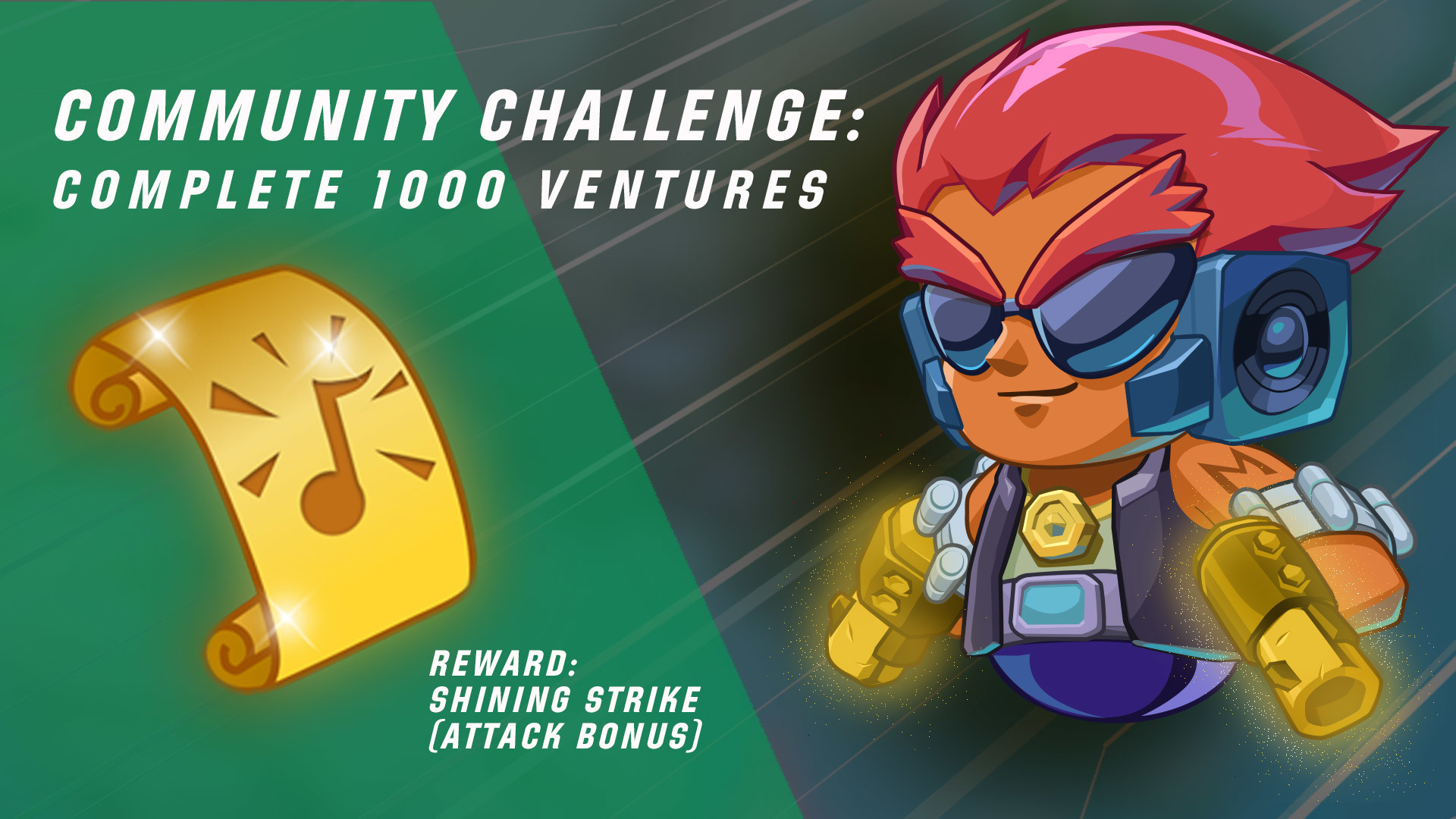 It’s time for the first community challenge. We need you to complete 1,000 ventures before 12:00 PM EDT on July 30th. If you manage to accomplish this feat, all players will be granted Striking Note on July 31!