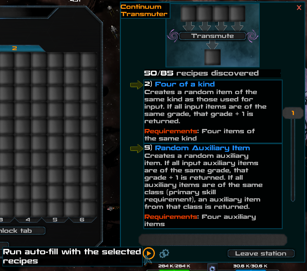 🎯 [UI] There have been various improvements to UI widgets. For example, the text search fields now support input of (almost) any length and a new color input field has been added. The latter enables a much wider degree of colors for the laser sights. 🎯 [Continuum Transmuter] The "Four of a kind" recipe auto-fill function now considers items of the same grade first. 🎯 [Bug fix] Fixed an issue that could cause Cloner-type drones to spawn incorrect projectiles. This could occur when switching from weapons that have projectiles which spawn additional projectiles. 🎯 [Bug fix] Fixed a grammatical error.