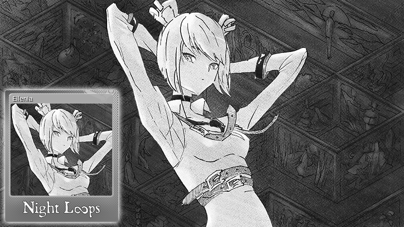 Since parts of Night Loops call to mind the completion of a self-portrait, we wanted the Trading Cards to feel hand-drawn. For this, the character art and backgrounds were drawn at various times these past years, either separately or together. Then digitally, were edited together, adding extra shading and final touches. (Exception is for Myne’s sanctuary background which all credit goes to Estella!)