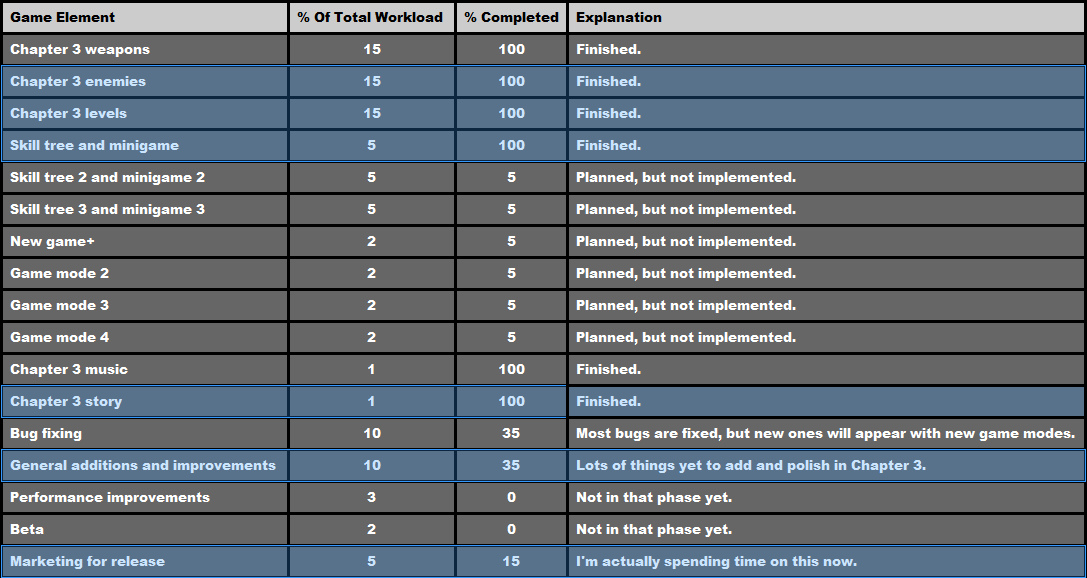 Once again, here's a look at what's completed and what needs to be done. Remember that this is only a very rough view of everything. Careful, the image below contains spoilers! Highlight the black bar to show.