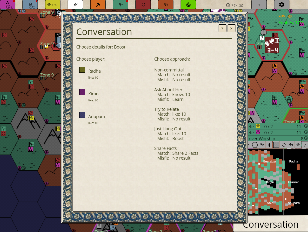 So, with this update, I've put in conversations. When you complete a conversation build action, you get to choose a player and an approach. The other player then chooses an approach to respond to you with and depending on whether they match or not, the results will differ. So, you can choose a riskier approach that is more likely to erupt into a campaign or a safer approach with a smaller bonus and either way you will get something that matches your assessment of your game state. I've had a lot of fun with this feature and I would love to hear what you think.