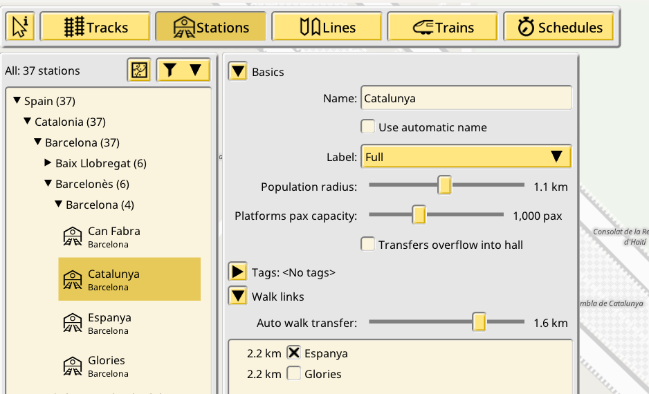 As mentioned earlier, in 1.15 stations have become persisting objects. This will enable new design and gameplay features, but for now the most visible one is a new top level editor in the left toolbar. The station editing options formerly located in the track editor are now located in the station editor. This means the track editor is focused on buildable physical elements, like tracks and declaring these tracks as platforms of some station. And the station editor focuses on more abstract concepts, like population radius, tags and walk links. A few of the most basic station editing options, like naming, will also remain accessible in the track editor.