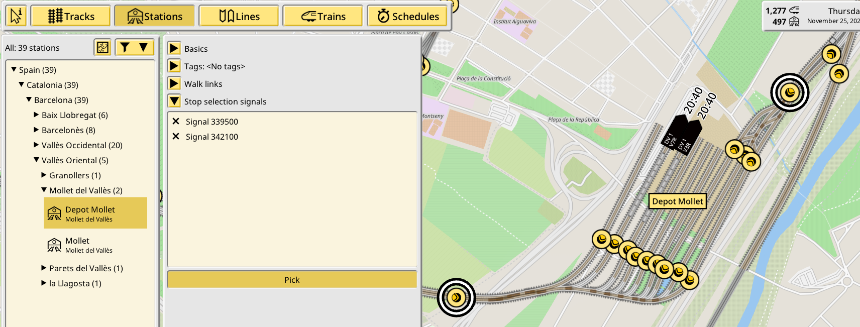 Line stop-level secondary stop signals have been replaced with station-level stop selection signals. This means that when you want to designate a signal for the role of being able to select secondary train stops, you must now do so in the station editor. When a train reaches a stop selection signal, and its current path ends on a track platform of a station which includes the signal in its set of stop selection signals, it will be allowed to change its destination stop area. This is the same functionality formerly provided by line stop secondary signals.
