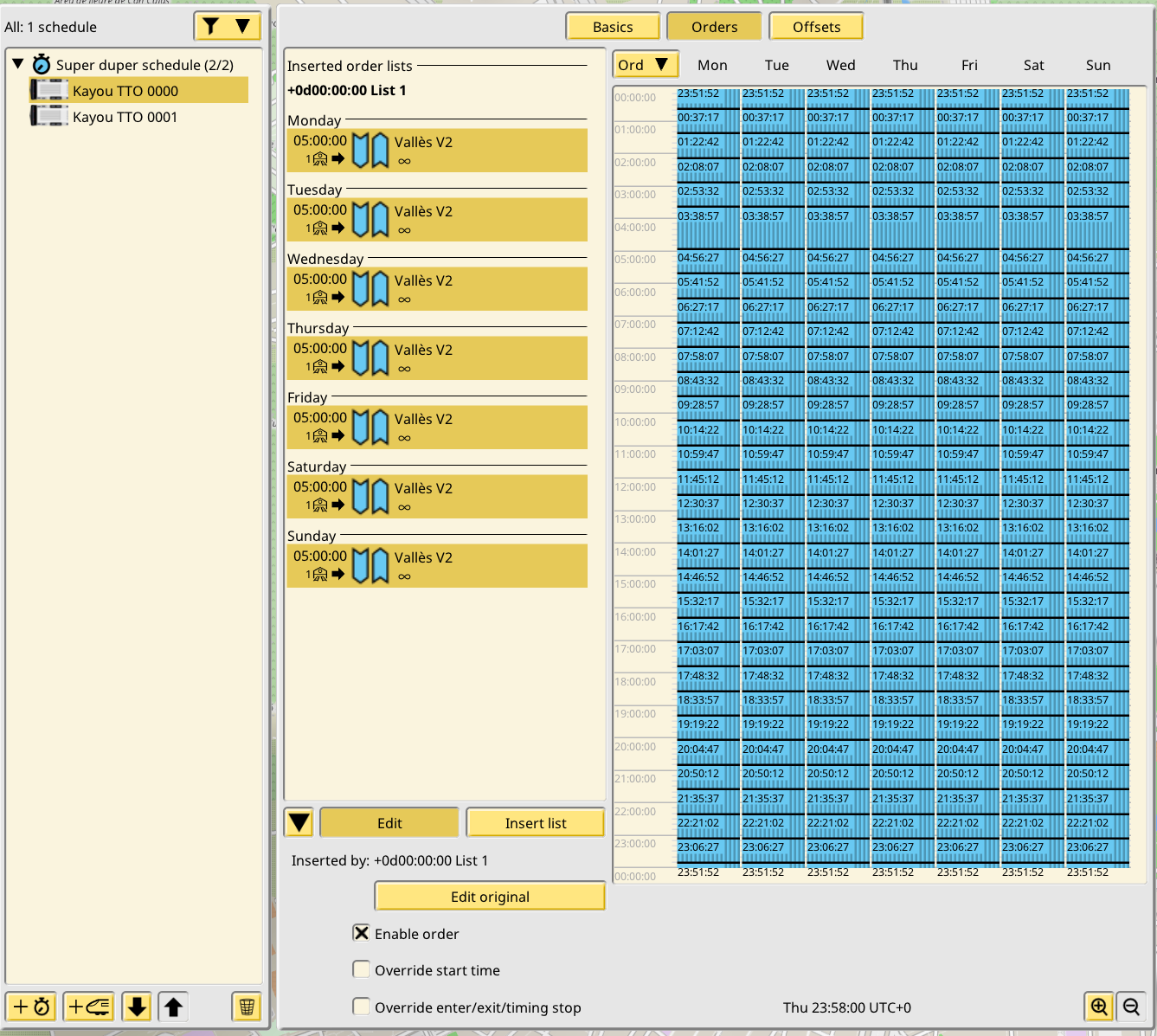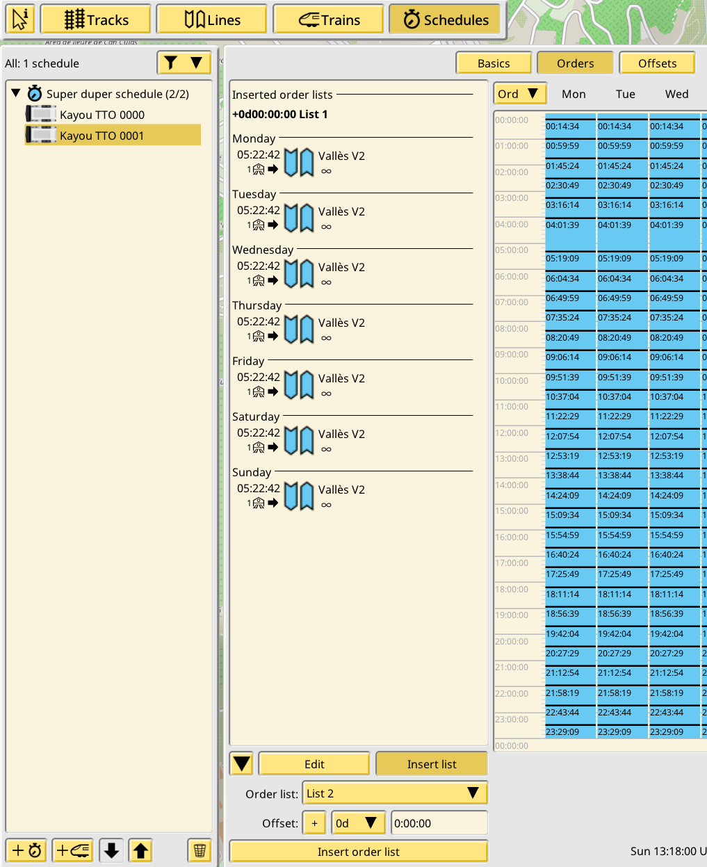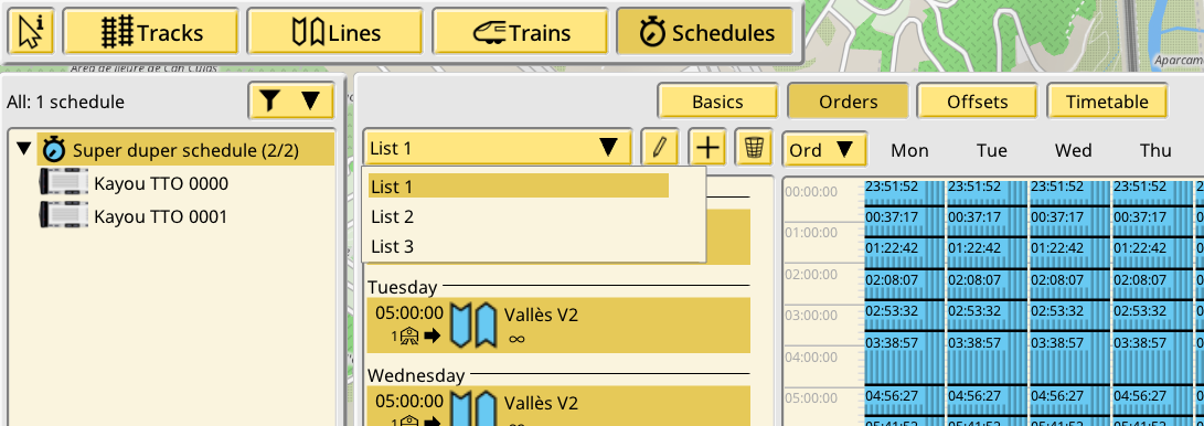 - Order lists: this is just a list of orders over a 7 day week, identical to the 1.13 train order list. Order lists are edited like the 1.13 train order lists too. A schedule can contain one or more order lists. Order lists are independent of any train, and are also independent of each other. They do not need to share any lines or orders.