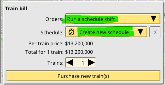 4) And that's it. Keep adding trains to the schedule on purchase, or by assigning trains in the Shift Basics panel. Remember: if in 1.13 you set a train as a copier, in 1.14 you create a shift in a schedule and assign a train to it (or you do it all at once on purchase).