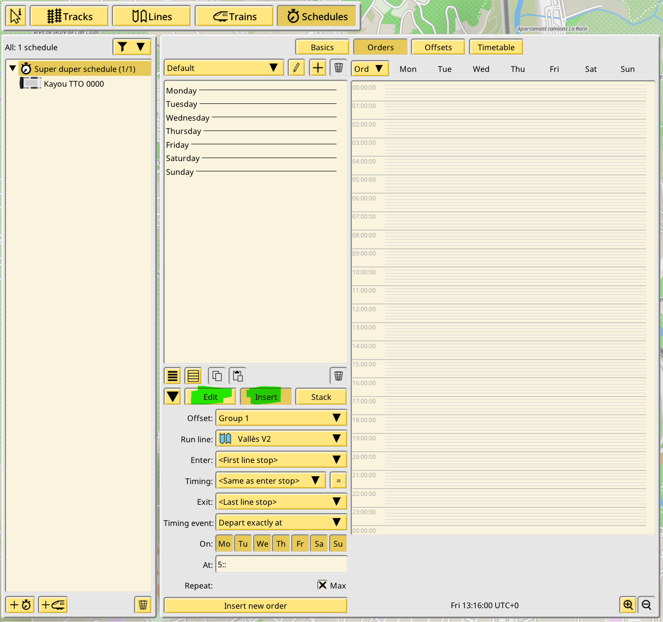 5) Since it's a newly created schedule its order list empty. In 1.14 orders are created at the schedule level, rather than at the train level. Unlike 1.13, which had a parent train where you edited orders and then zero or more copiers, in 1.14 all trains are copiers. In the Schedule Orders tab you can create and edit orders. The trains in the shifts of this schedule will auto copy them. Orders in 1.14 behave identically compared to orders in 1.13 if you don't use any of the new order features. Use Insert to create new orders, and Edit to edit existing orders.