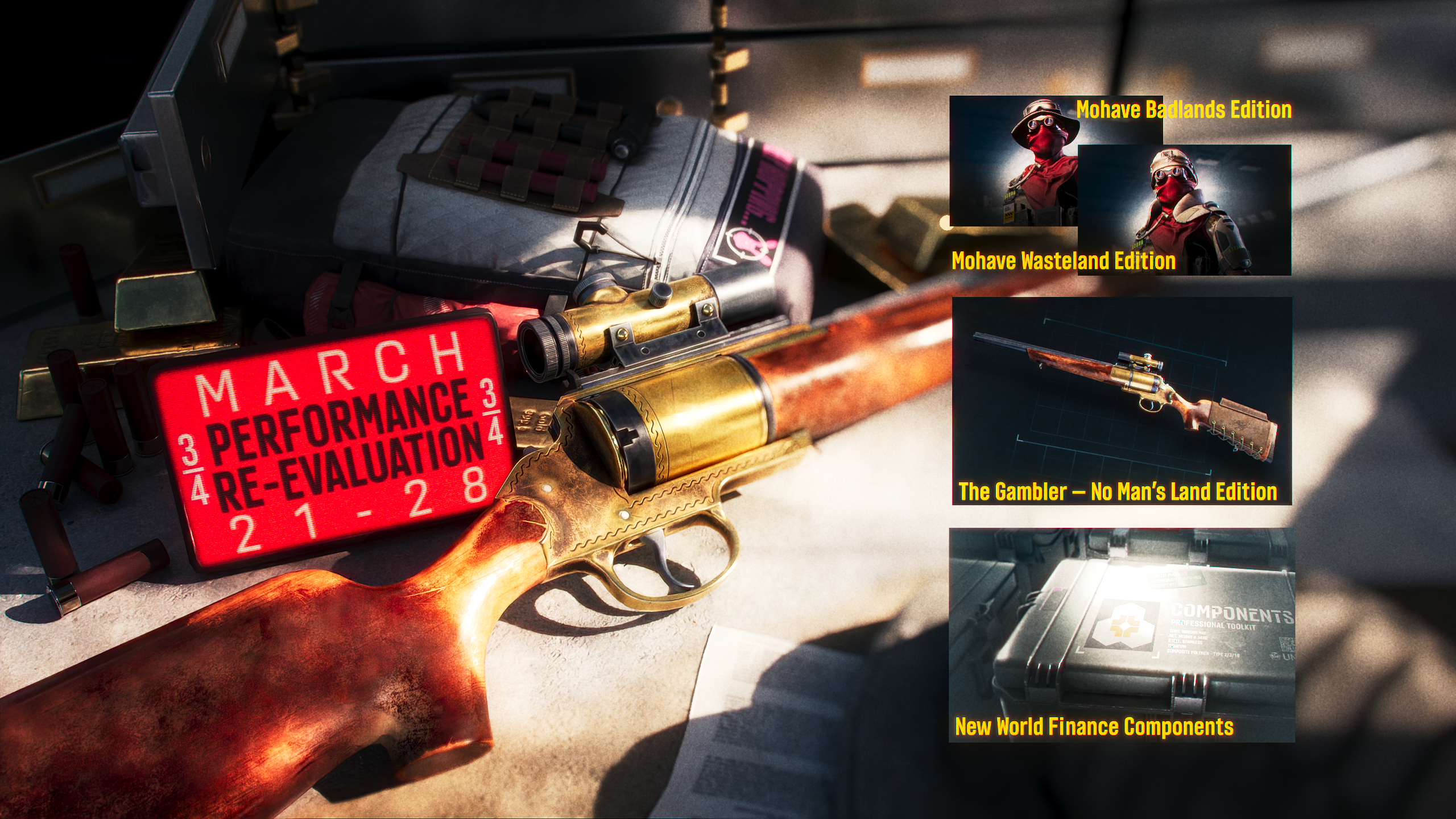 And there is no better way to show off your skills than the Performance Re-Evaluation event! Complete as many assigned tasks as possible and walk away with some serious bonuses, including "Mohave Badlands" and "Mohave Wasteland Edition" armor sets and the trusty Gambler "No Man’s Land Edition" rifle.