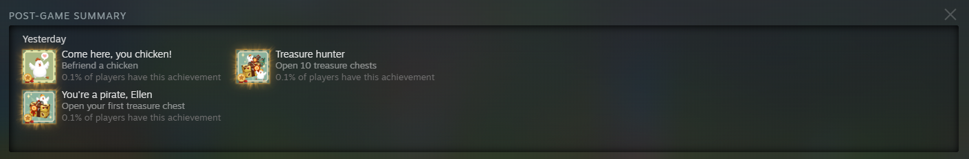 Steam achievements are here! Now all the in-game achievements will be connected to Steam, so you’ll be able to track your game completion from the app level and be able to show off to your friends.