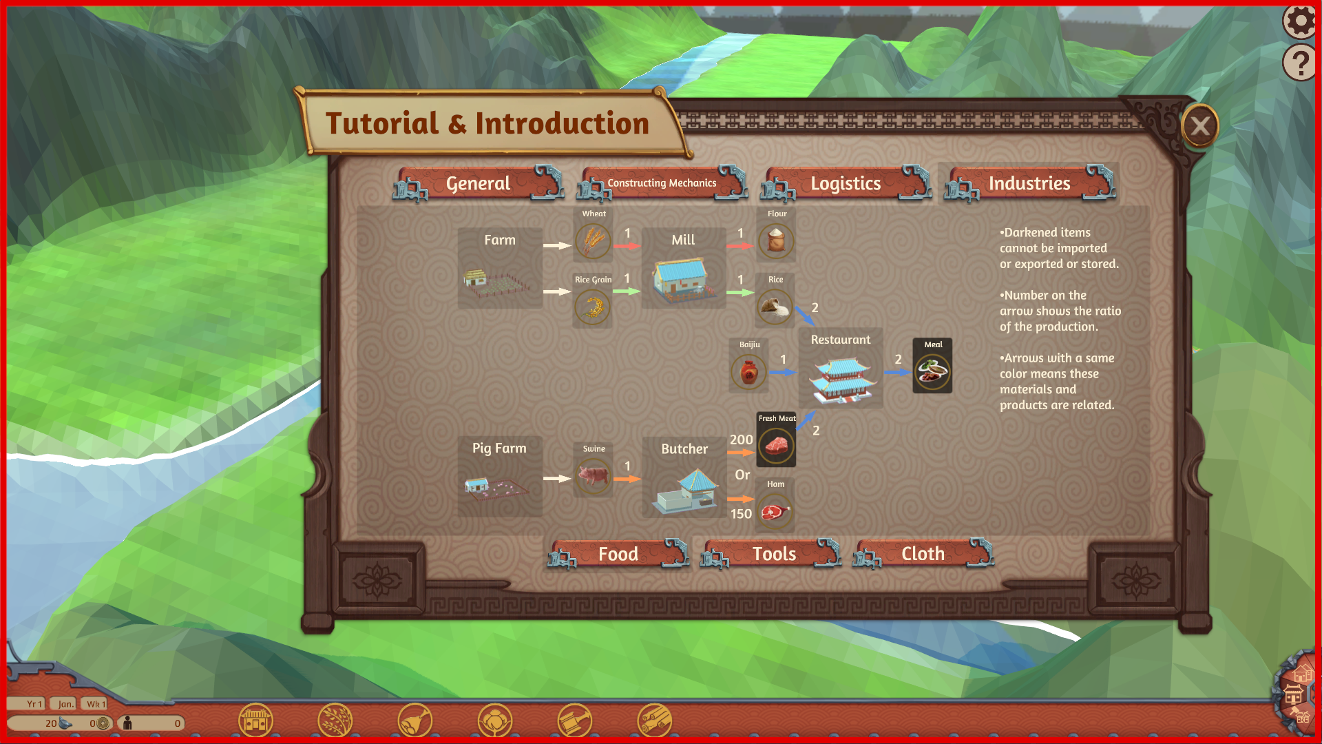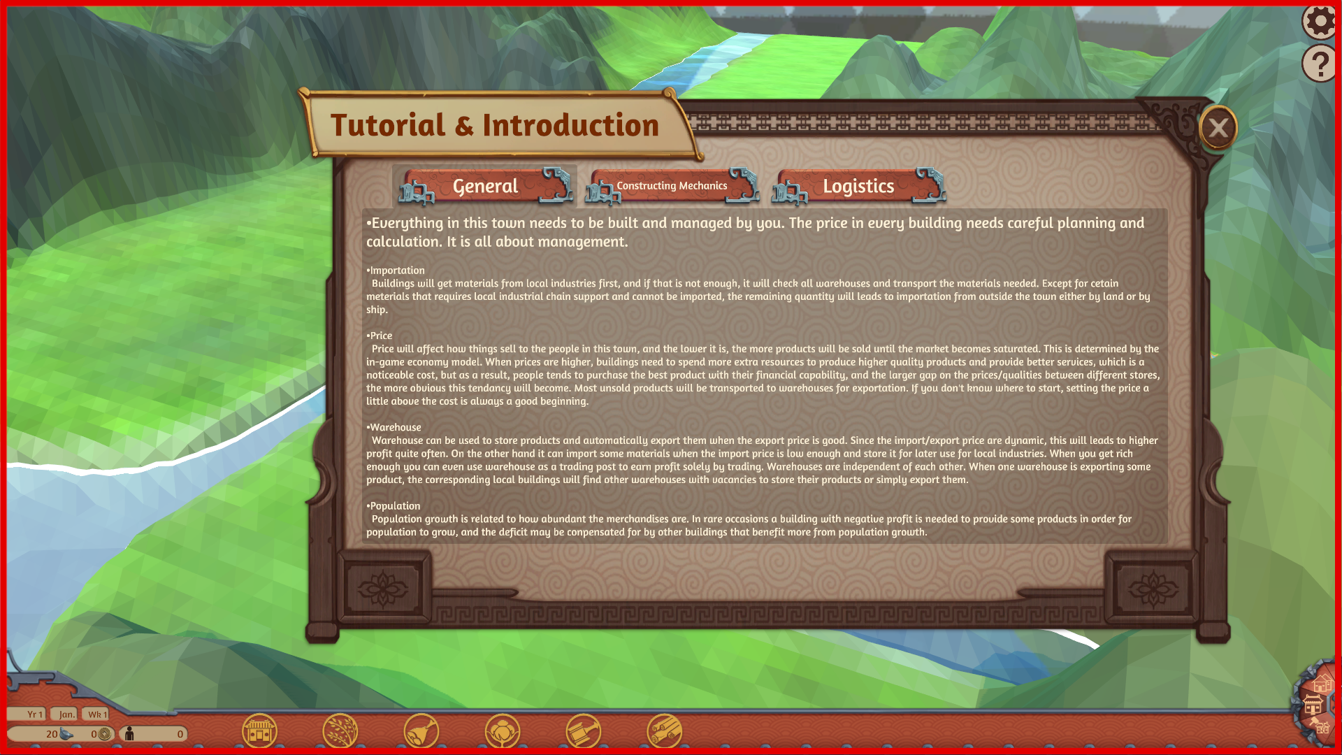 Tutorial Panel is now added into the game. When player first enter the game, the tutorial panel will show up and time will be paused. It can also be opened through the button on the upper right corner. This includes basically all necessary introduction of the game design and some explanation to help player playing the game. If something is still not mentioned here, it is very likely left out on purpose for players to explore and figure out like the exact behavior of the market model.