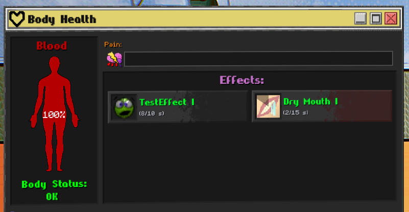 - Practically identical to Project Zomboid’s health system, but slightly simplified for gameplay fun sake - Each body part can have N amount of trauma. Some trauma affects only that body part, while others affect your entire body. - Debuffs depend on what part of the body gets the trauma, what kind of trauma and how severe it is - Same types as the blood system
