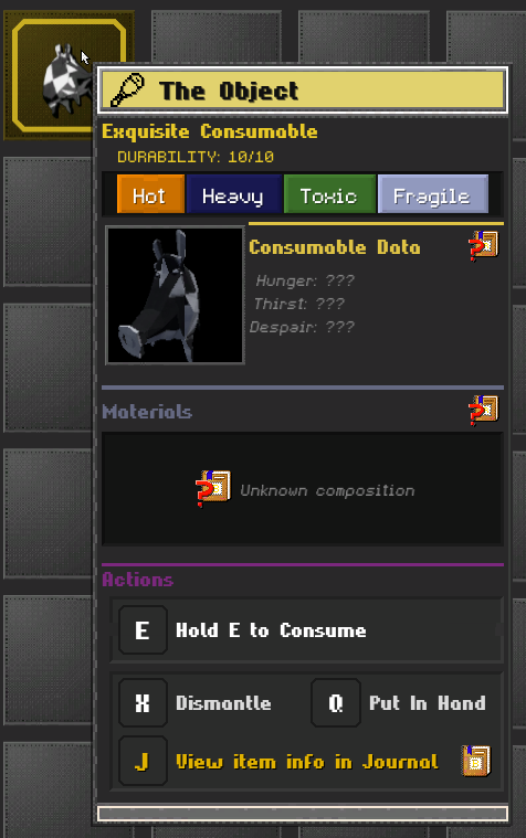 That's where it weaves into the progression. In the beginning, you would be quite confused about what everything does. Considering I've already added tons of new mechanics, items and soon-to-come biomes (I promise I'll add more biomes than the construction rooms I just want the level design to be the best it can be) But with the journal, you will be able to kinda understand what's around you. Well, I hope to do so anyway - can't promise subjective stuff like this :P. But the general idea is that you gain knowledge and then fill it in, where you discover new ways to use items, different new mechanics and whatever and so forth