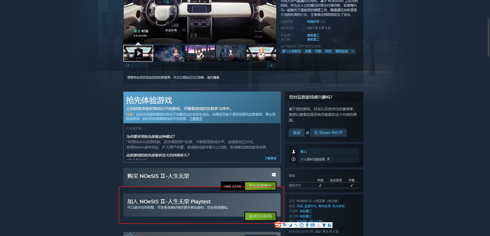 很非常高兴地宣布我们的游戏《 NOeSIS Ⅱ-人间无常》,结束了漫长的先行测试,并得以正式发布。为了游戏发布我们在付出了大量的心血,希望你们会喜欢我们的游戏。