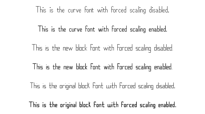A comparison of the three fonts with forced scaling on and off at 1080p: