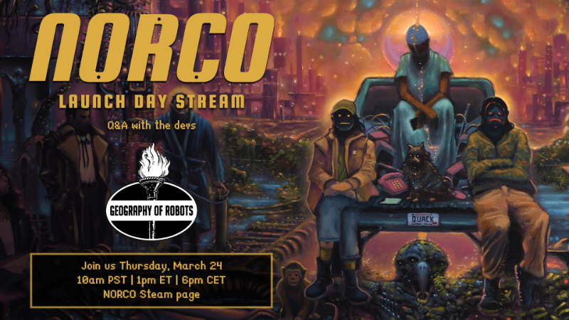 The livestream starts on Thursday, March 24 @ 10am PST // 1pm ET // 6pm CET right here on the NORCO Steam page. Meet the developers, ask some questions, and celebrate the launch of NORCO with us!