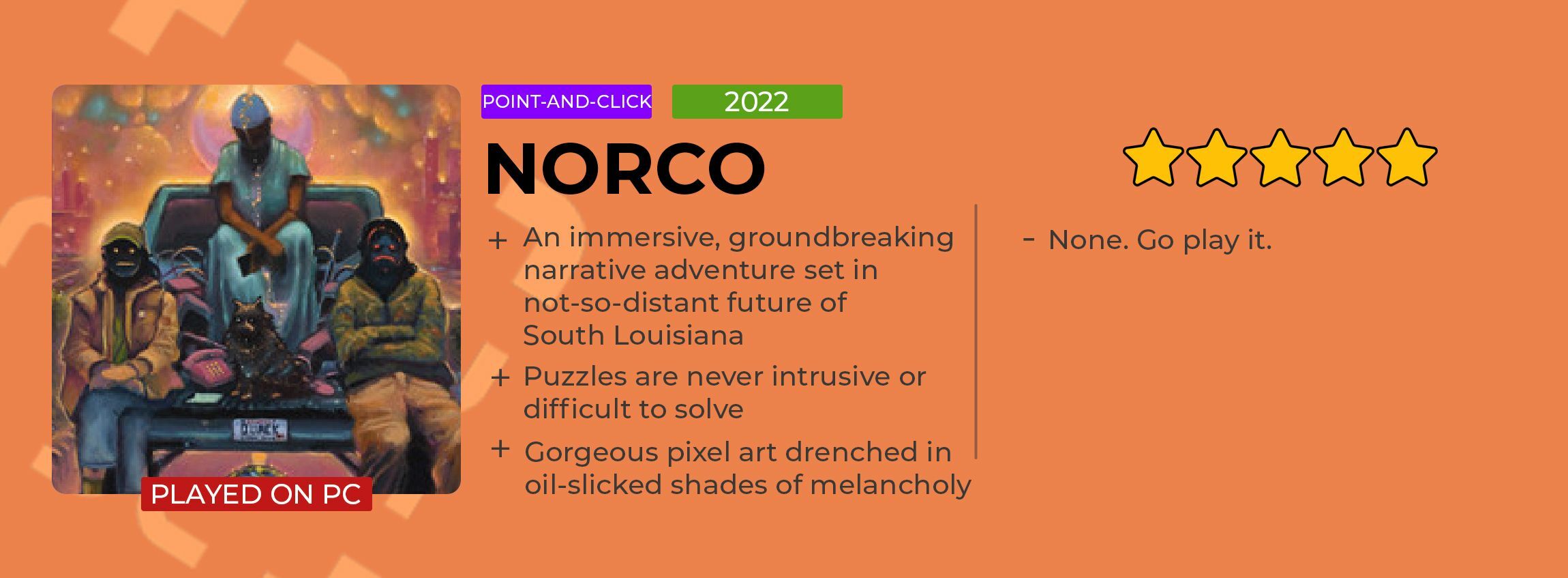 Listen to music from the game – We recently announced the NORCO Original Soundtrack, a collaborative album available March 24 that contains the complete in-game score by Gewgawly I (the Geography of Robots composer) as well as an album's worth of new songs by sludge band Thou, our longtime friends and fellow South Louisiana artists. You can listen to six track samples here.