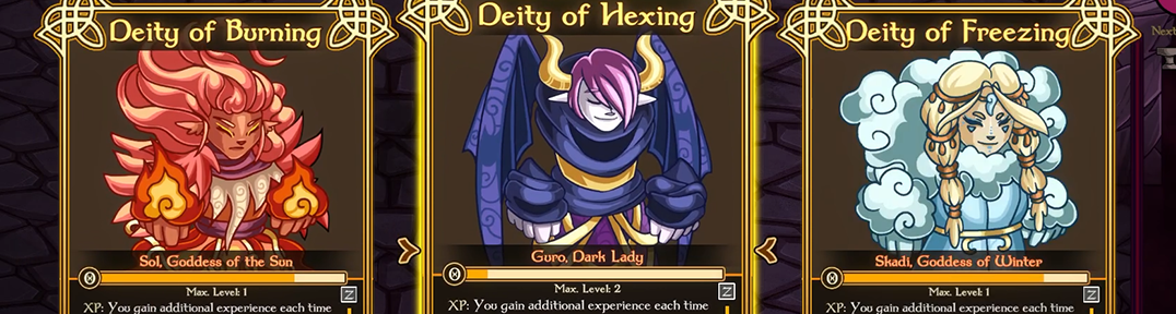 To join you in this battle, you will be gifted by a deity of your choice to improve your runs substantially. Let’s say you choose Sol, the fire deity. This means, the probability of fire relics will drastically increase, so synergies will be more available. Your deity will also perform a variety of attacks that will get stronger and stronger as you level up both during the run and outside, as you raise your affinity level with them.