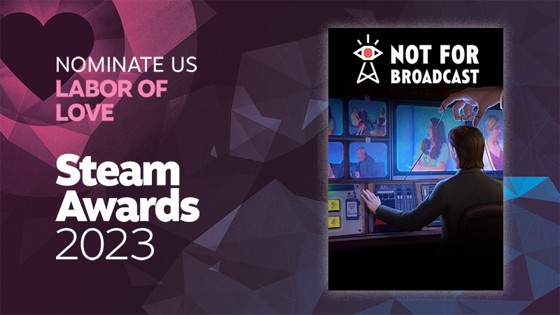 We'd be incredibly grateful if you'd consider nominating Not For Broadcast in the "Labor of Love" category of the Steam Awards 2023 🙏 Together we can make it happen!