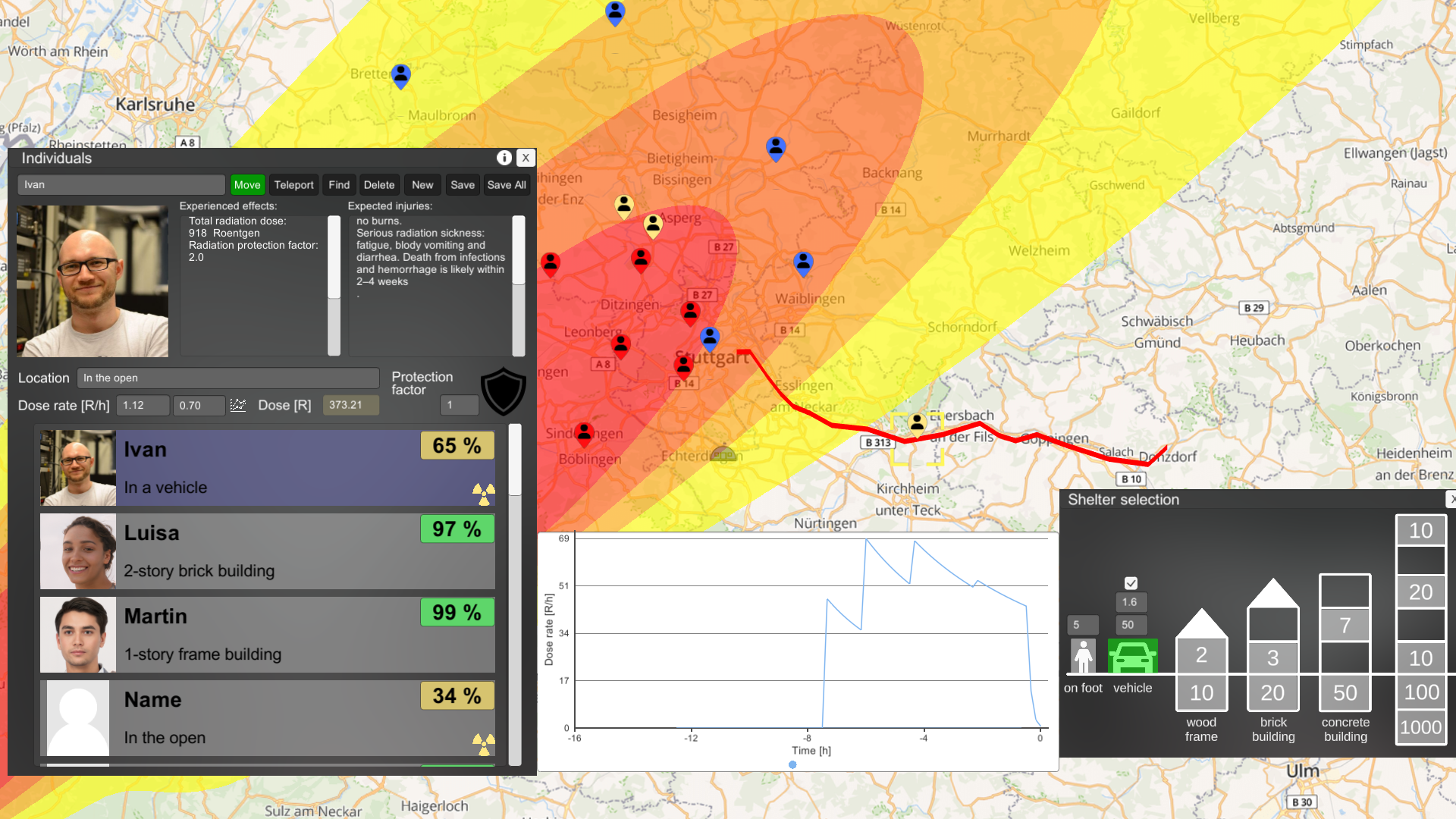Human individuals can now move on the map and radiation dose from fallout is calculated and displayed in a time-resolved fashion. Civil defense situations and other aspects of survival after a nuclear war can now be simulated. There is a new UI for intuitive selection of shelter. Humans can move on foot or in a vehicle (if available). The speed and protection factor of the vehicle can be set in the UI. The route can be chosen by clicking multiple times on the map.