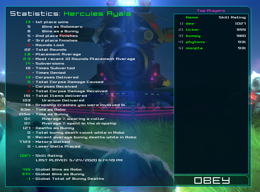 Some of you may not know that OBEY 1.0 has been tracking many of your gameplay stats!