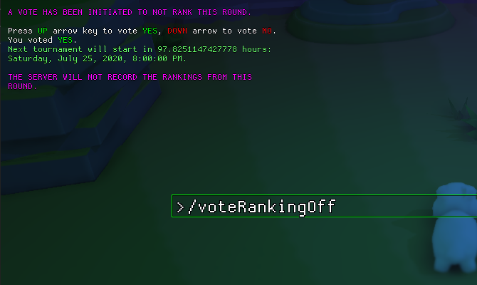 * /voteRankingOff start vote to not rank the current match (this is so you can screw around on a ranked server without messing with your ranking, if you want)