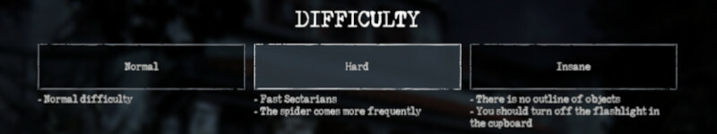 1. Added difficulty levels. Be careful, on "insane" difficulty, the cultists will kill you in the cupboard if the flashlight is on!