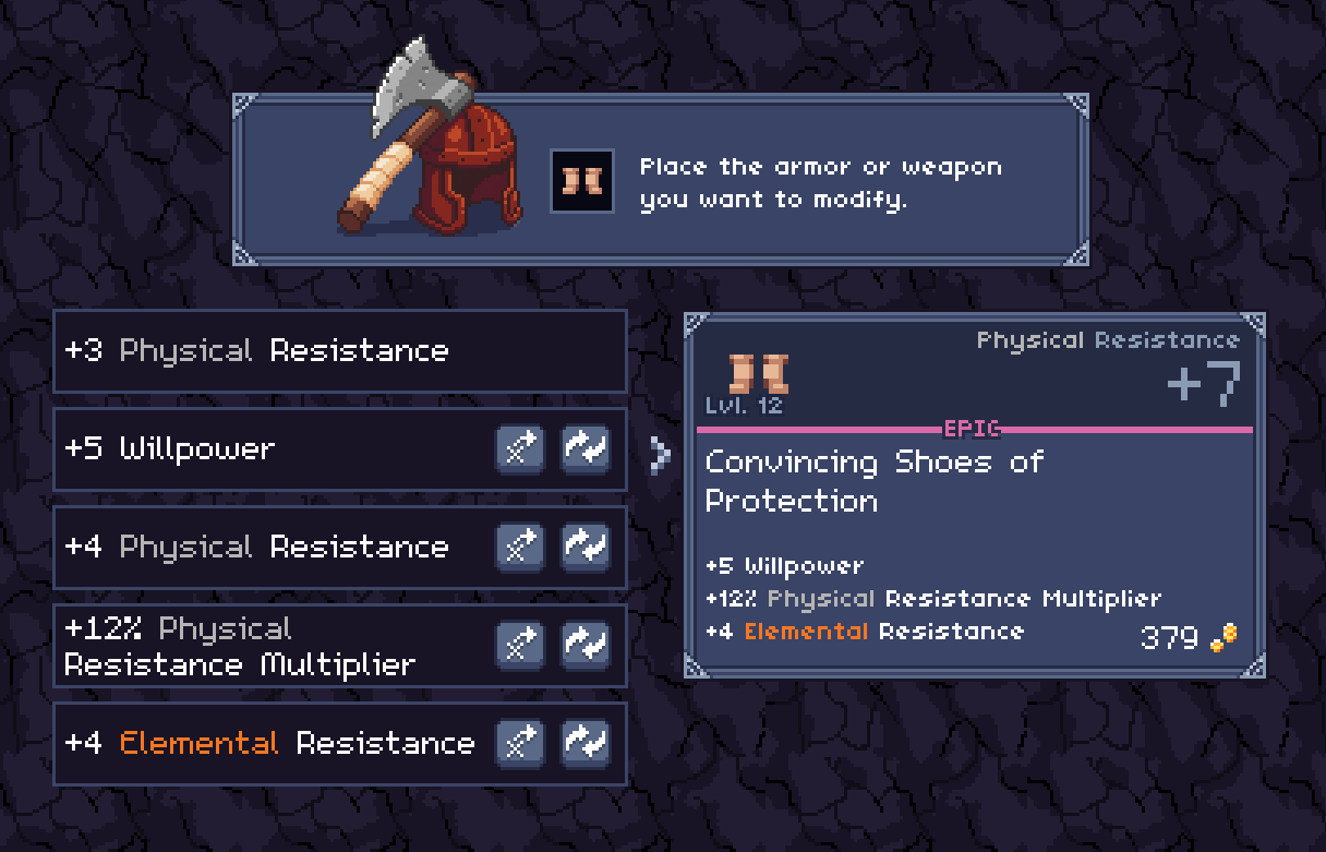 There are also some restrictions: - You can't modify Legendary items. They are somewhat unique and their stats are fixed. - You can't add more stats to an item. You can only replace existing stats. The number of item stats is defined by the item's quality.