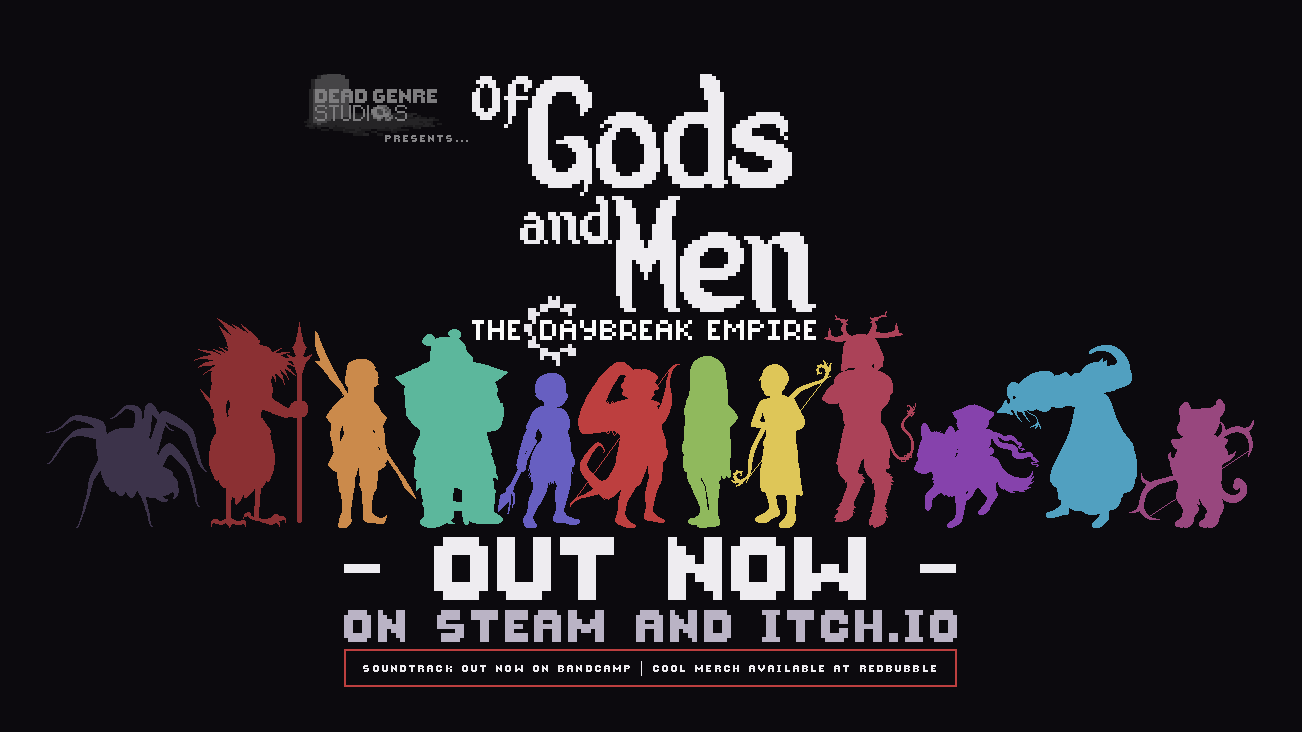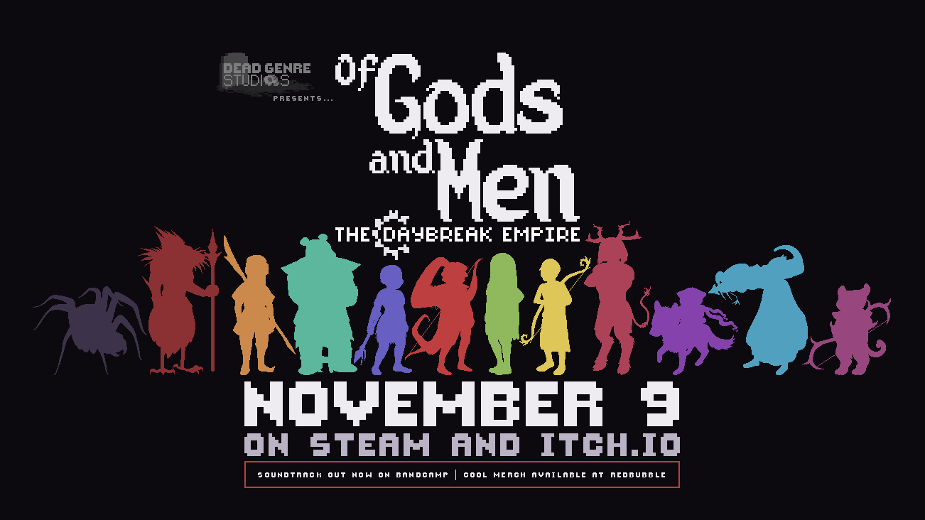 Of Gods And Men: The Daybreak Empire is set to release on November 9th 2018 for PC on Steam and Itch.io. Our retro, story-driven, turn-based tactics game will be on sale for 40% off at $4.99 USD for the first week! Please wishlist it so you don't miss it!