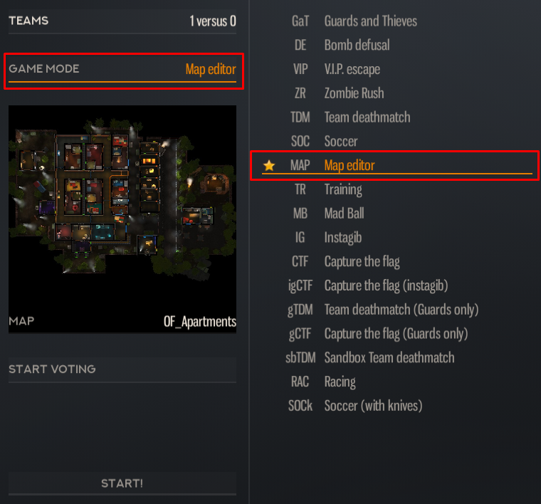 To use the Map Editor simply select it in the gamemode selection screen, after that click "create new map" button inside the map selection screen and then select the mao you want to edit If you need help reach us inside our official Discord server!