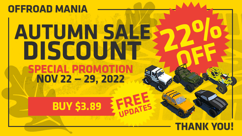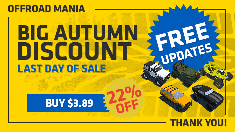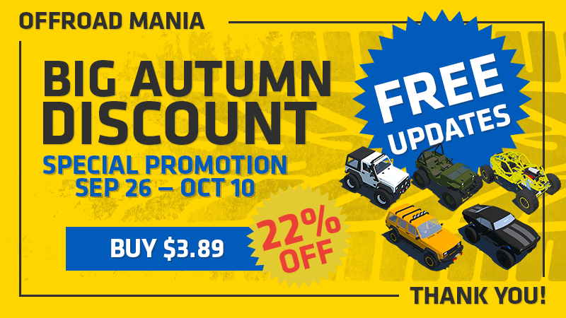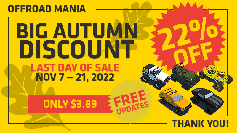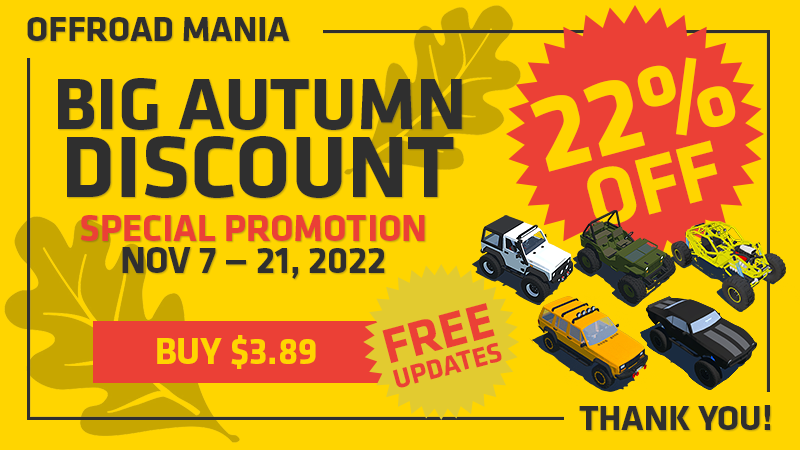 Today (Oct 10, 2022) — is the last day of "BIG AUTUMN DISCOUNT" and your last chance to buy Offroad Mania with special price with Discount 22% for only $3.89! (*or less for some regions)