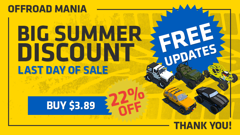 Today (Aug 29, 2022) — is the last day of "BIG SUMMER SALE" and your last chance to buy Offroad Mania with special price with Discount 22% for only $3.89! (*or less for some regions)