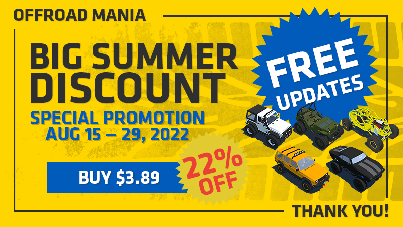 You can support us and buy Offroad Mania with our special discount 22% (AUG 15—29, 2022).