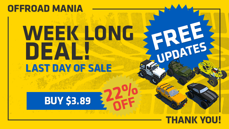 Today (Jul 18, 2022) — is the last day of sale "Week Long Deal" and your last chance to buy Offroad Mania with special price with Discount 22% for only $3.89! (*or less for some regions)