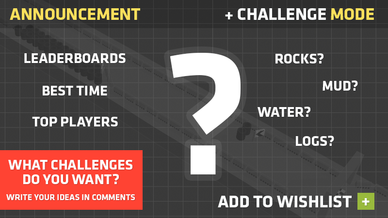 Now we work on the next update, where you will see a small challenges with various obstacles (rock, mud, water, logs, etc.). These are short challenges, each with its own leaderboard.